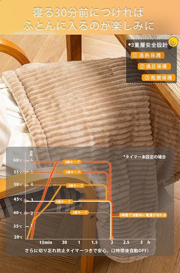 【6段階温度調整&5段階切タイマー&自動電源オフ】従来の電気ブランケットとは異なり、強-中-弱の3つのモードだけではなく、1から6までの温度段階「25℃、30℃、35℃、40℃、45℃、55℃」を調整できる電気敷き毛布です。人が快適に眠れる寝床内温度は32~34℃、自分の体温や周りの気温に合わせて、快適な温度に設定できるのが特徴です。2H/4H/6H/8H/12H切タイマー機能付き、お好みによって設定可能、時間が切れると自動的電源オフ、お年寄りや子供でも安心して使用できます。(セットしない場合は、起動後2時間自動的に電源が切れますので、電源をうっかり切り忘れることを防止します。)