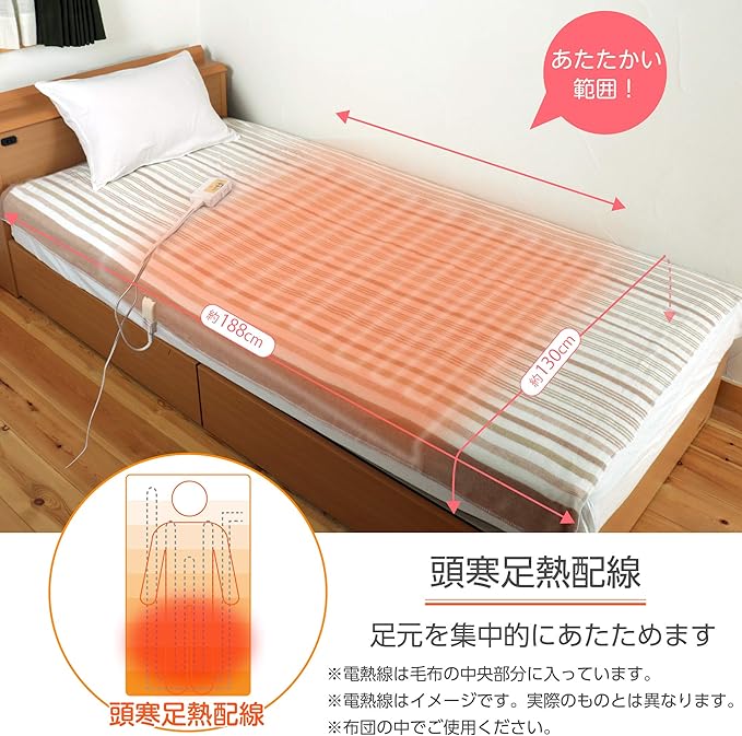 【温まる範囲について】こちらの電気毛布は、頭側から38cm、足側から30cmには電熱線は入っておりません。電熱線が入っている部分は中央部分になります。なぜ電熱線が入っていない部分を多くしたかというと、寝ている間に毛布がずれてしまうことがないように電熱線が入っていない部分を布団に折り込み、ずれにくくするためです。また、折り込まなくても温まらない部分の面積を増やすことによって、寝返りをうっても毛布がずれにくくなるという効果もあります。敷き毛布として使った場合では、身長160cmの方でおよそ足先から胸までが温まります。掛け毛布として使った場合には、身長160cmの方でおよそ足先からお腹までが温まります。※個人差があります。下半身を重点的に温めたい方におすすめします。