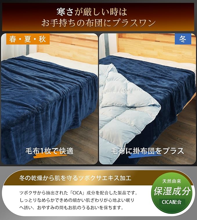 【CICA保湿加工を施した洗える毛布】一重タイプの毛布は夏冬兼用。春夏秋はこれ1枚で、冬はお手持ちの布団にプラスワン。オールシーズン大活躍。軽くて持ち運びやすく収納も便利です。使用シーンを選ばないちょうど良いサイズで、リビングやオフィスでも、スポーツ観戦、釣り、登山、キャンプ、車中泊、旅行、アウトドアなど、あなたが寒いと感じたら、どこでも快適に使用することができます。ひざ掛けや肩掛けとしても使いやすいです。