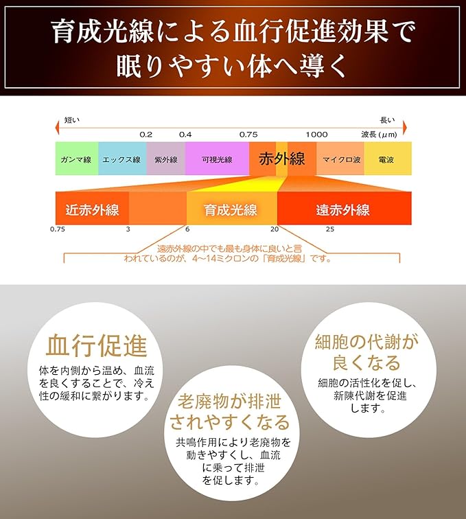 【従来の「吸湿発熱毛布」との違い】吸湿発熱繊維を採用した暖かい毛布は、水(汗)に反応して発熱するのですが、汗をかかないと暖かくならないため、使用直後に暖かさを感じにくかったり熱すぎてムレたりすることが多いです。その反面、遠赤発熱毛布は、自分の体温で体を温めるので、早く温まるのと、身体の内側まで温まったり、一度温まると冷えにくいのが大きな特長です。寒さが苦手で、なかなか寝付けない/表面だけでなく、体の芯から温まりたい/血行促進で、朝まで快適な睡眠を求めている方にオススメです。さらに注目すべくのは、遠赤外線に水分蒸発を助ける働きがあることです。W極 のあったか毛布は発汗による湿度の上昇を抑え、睡眠中の体温変化や発汗による蒸れを軽減。温度と湿度を快適なバランスで保ってくれます。冬でも汗かきさんの寝汗、汗臭問題を解決。睡眠環境の質向上をサポートします。