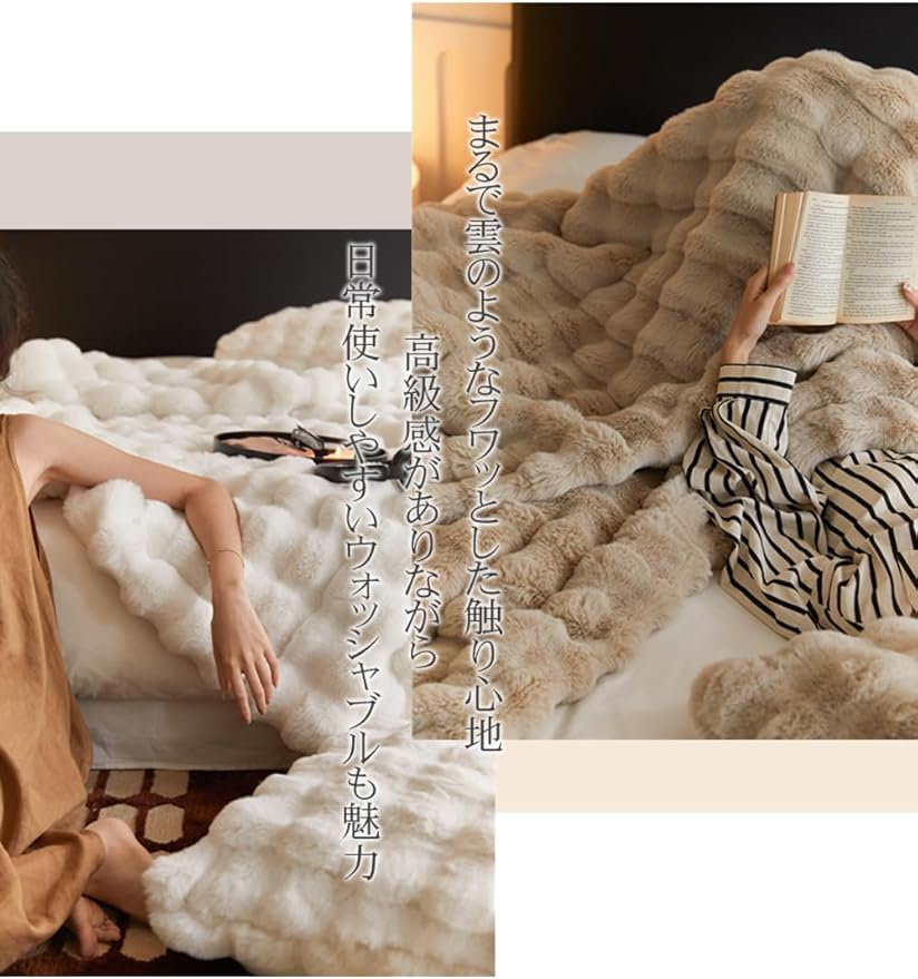 【高品質な素材&二枚合わせ毛布】 VERILADY毛布はラビットファー調二枚合わせ毛布、両面ふわふわ素材、高級感up、保温性が良い!おしゃれなお部屋を演出し、寒い冬でも暖かくお過ごしいただけるブランケットです。ふんわり柔らかく、しっとりとした肌触りに癒され、心も体も温めます。ふわふわで良い肌ざわりの生地で、耐久性に優れています。