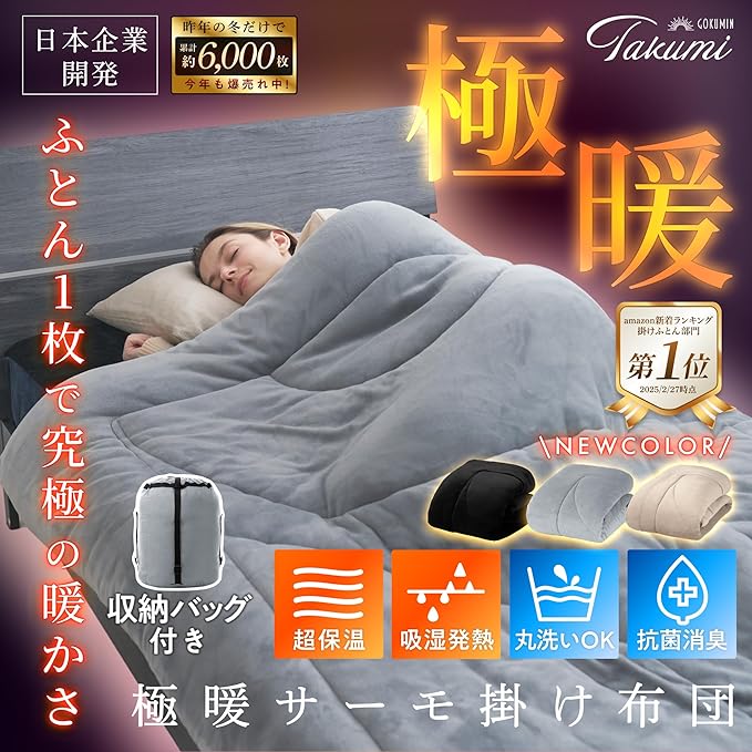 人生の1/3の時間を占める「睡眠」を徹底的に研究し、極上の眠りと、翌朝の目覚めさえもよりよくする寝具を作りたいという思いで企画開発。「高価な寝具には劣らない品質」と「寝心地」で、手に取って頂いた後も末永くご満足いただける商品を提供いたします。[商品詳細]●サイズ /約150x210cm ●製品重量(約)/3.1㎏ ●カラー/ブラック・グレー・ベージュ ●側生地/ポリエステル85%、レーヨン15% ●中綿/ポリエステル80%、アクリレート20%(アルミシート入り)、収納袋/ポリエステル100% ●収納サイズ※圧縮前(約)/31x33x46cm ●プレゼントに最適な高級化粧箱でお届け※SDGsの観点から、包装紙に包まずお届けとなります。●日本語取扱説明書(1年間保証書付き)●日本企業設計・開発・販売、中国専用工場生産