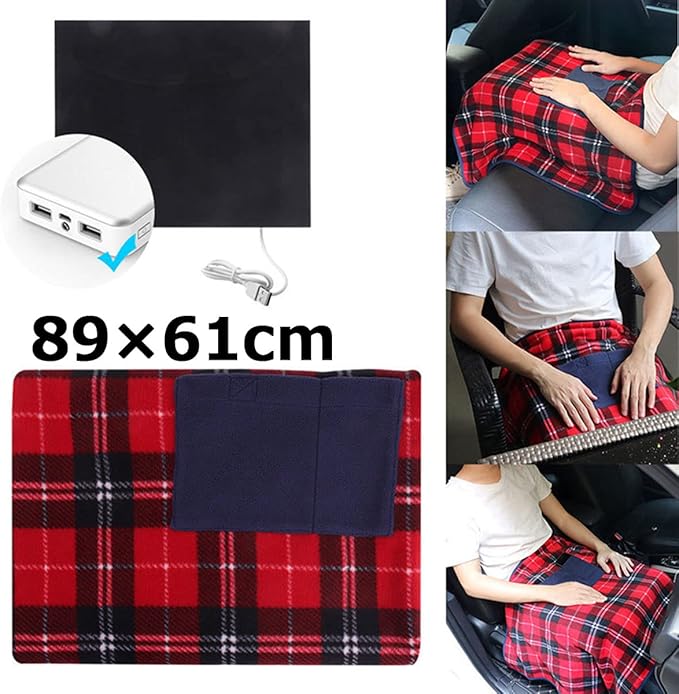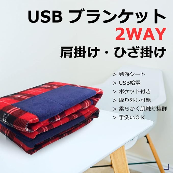 USB ブランケット 電気毛布 ひざ掛け 洗える 電気ひざ掛け 毛布 usb給電 USBヒーター ホットブランケット オフィス アウトドア キャンプ 防寒 省エネ 電気ブランケット 89 61cm チェック柄 (ブルー)