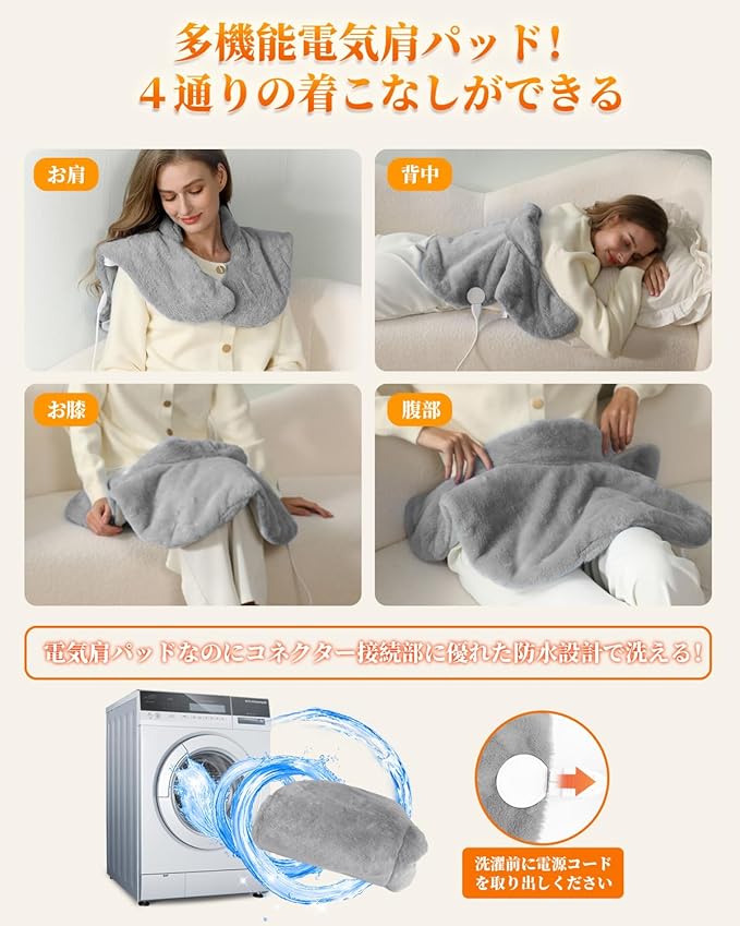 【やわらかい感触に包まれて、究極のくつろぎを楽しむ】 電気肩掛けは従来のシープ毛ボアを捨てて、トップのダプルクリスタルベルベット生地を採用した。密度の高い超極細な繊維が触れるたびにまるで絹のような滑らかで柔らかさを満喫する。掛けて敷くことができて、いつまで雲のように軽やかで柔らかくて、身にかけて、肩、首、背中の疲れを和らげると同時に、じんわりとした温もりが体になじみ心までほぐれる。※人間工学に基づいて設計され、首/肩/背中の上を完璧に密着し、圧倒的なフィット感を生み出している。※ 超極細フリース繊維は保温性、通気性に優れ、摩擦にも強い。何度洗濯しても毛玉や糸くずが出てにくく、長持ちして利用できる。
