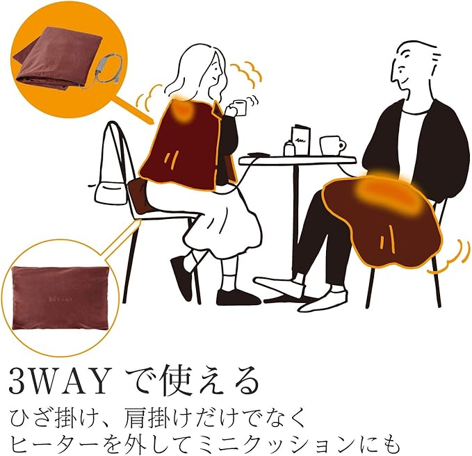 ■ひざに掛けて使うことで、おなかをヒーターで温めることができます。肩に羽織ると、背中部分を温めることもできます。読書などリラックスタイムに最適です。