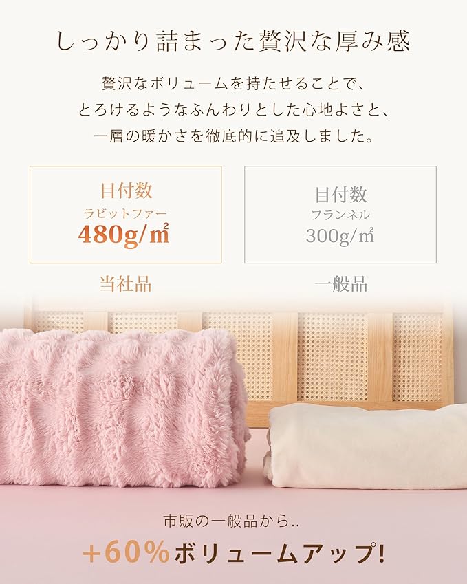 【プラス5℃蓄熱保温】480g/㎡高密度ラビットファー調生地とフランネルの組み合わせで、普通のフランネルカバーより、蓄熱保温効果が倍増!マイクロファイバーが高密度に詰まっており、毛足に空気を多く包み込んでいるため、暖かい空気をしっかりと閉じ込め、身体の熱を保持します。人体が放出するエネルギーを吸収し、布団内部の温度を上げ、熱を蓄えます。布団に入った瞬間、ふわふわぽかぽかな暖かさに包まれます。