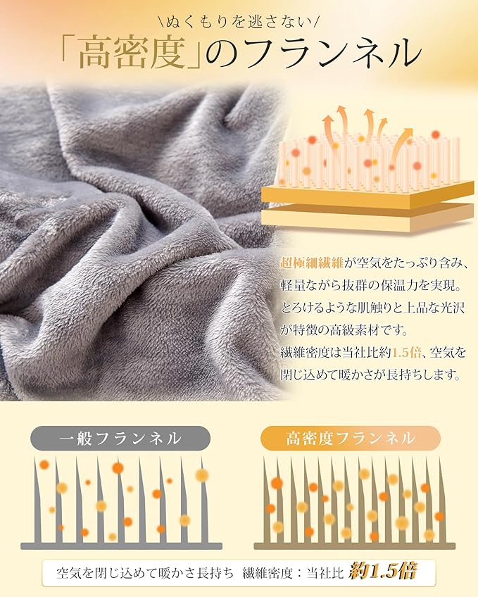 【柔らかくて通気性もよい】ブランケットの両面は超極細繊維のフランネル生地を採用しており、ミルクのように滑らかで柔らかな肌触りと高級感のある光沢を兼ね備えます。中層は吸湿発熱機能の中綿を詰めるので、体から発散する汗などの湿気を吸収しやすく、素速く乾きます。通気性がアップするので、さらさらとした睡眠環境を提供することができます。