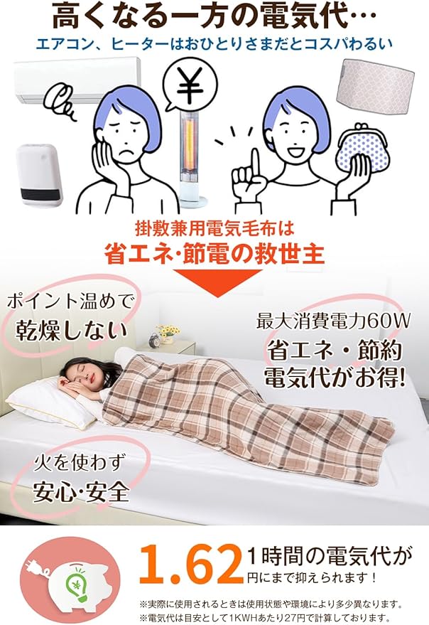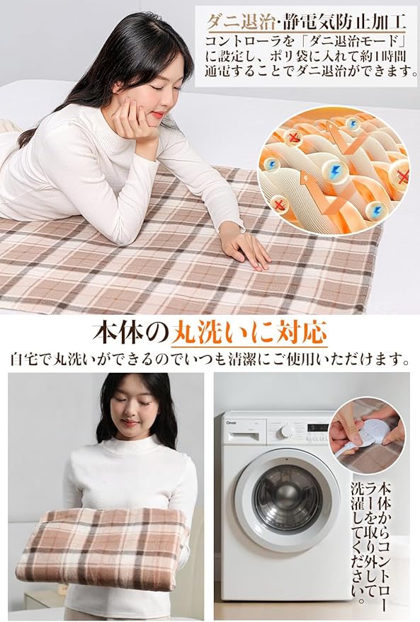 【心地良い質感・優れた保温性】電気毛布は暖かみのある両面チェック柄を採用。ふんわりと包み込んでくれるような生地で、すぐじんわりと暖かくなります。優れた縫製技術のおかけで、極細繊維がちゃんと詰まっていて、肌触りだけでなく、毛玉ができにくい素材、高い保温性、速乾性と耐久性を兼ね揃えます。寒い季節に冷えたベッド・ふとんや身体をぽかぽかにあたため、心地よい眠りに導いてくれる電気毛布。