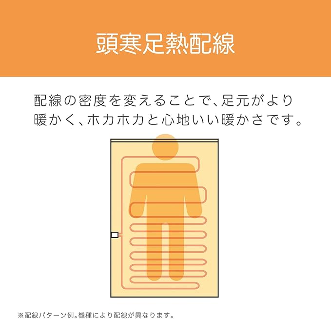 ●頭寒足熱配線:配線の密度を変えているので足元からホカホカと、カラダにやさしい暖かさです。