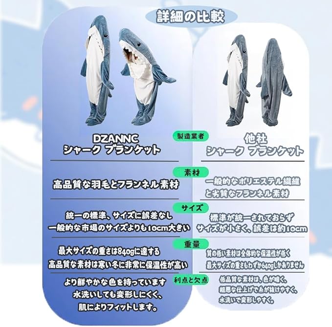 【シャーク ブランケット】: シャーク ブランケットのブランケットは、大人から子供まで幅広い年齢層に愛される、楽しいアニマルブランケットです。サメの形状が特徴的で、着ることができるので、寝袋やパジャマのように楽しむことができます。