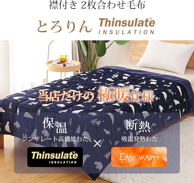 【4層構造で保温力倍増!】上層と下層はなめらかな肌触りのフランネル毛布で、その間にシンサレート綿と吸湿発熱中綿を挟んでいる。2枚合わせのサンドイッチ構造だから優れた断熱効果があり、保温性もより良い。保温力たっぷりの冬用毛布!