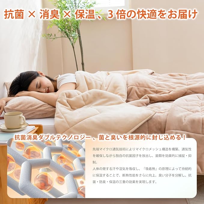 「極上の肌触り!高密度の超極細纤维が吸湿性と柔らかさを両立」もうふの表面は高密度に織られた「超極細纤维(マイクロファイバー)」を使用しました。驚くほどなめらかでやわらかい肌触りは、そのままに、高い吸湿性で寝ている間のムレを軽減します。直接肌に触れても気持ちいい、心地よい寝心地をぜひお試しください。洗えば洗うほど柔らかくなるのも魅力です。