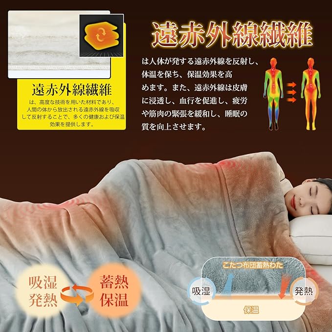 【発熱】シンサレート毛布は2024年にリニューアルされて、中綿が増量。さらに遠赤外線繊維(膝サポーターや保温衣に使われる素材)が混紡されて、体の熱を吸収して反射し、保温効果を高めます。遠赤外線は血行を良くし、筋肉の疲れを和らげて、睡眠の質もアップします。