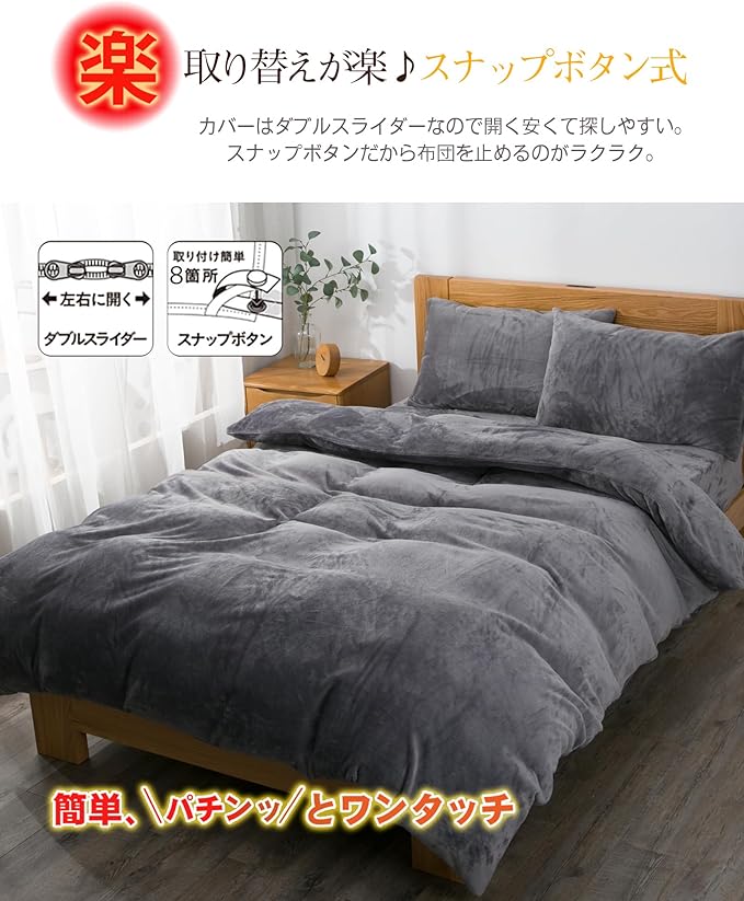 【お手入れ簡単】❶一般的なズレ防止紐の場合、一つ一つ結ぶ必要があり、非常に手間が掛かってしまいました。弊社のふとんカバーはスナップボタン式となっているので、布団についているループに紐を通しパチンと止めるだけ!❷ ダブルファスナーでファスナーを両端から開閉出来る仕様を採用しますから着脱しやすい。❸【ご自宅で丸洗い可能】:洗濯耐久性に自信あり!ご自宅の洗濯機で丸洗い可能、いつでも清潔に使えます。面倒家事も短縮できます。