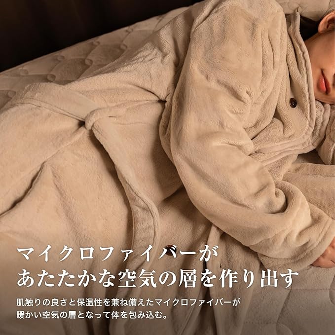 【暖かさ約3倍!】極温の着る毛布は、従来品のマイクロファイバー着る毛布と比べ約3倍の暖かさ。超極細繊維が詰まったプレミアムフランネル生地が身体を包み、朝まで続く暖かさを実現します。極温着る毛布のきめ細かい毛並びが肌に吸い付くように密着するので、暖かさに包まれながら快適に過ごせます。【高級感あふれる肌触り】極温着る毛布は、触れた瞬間に包み込まれるような上質な肌触りです。軽量で暖かさにも妥協しない贅沢な温もりで心を安らかに。