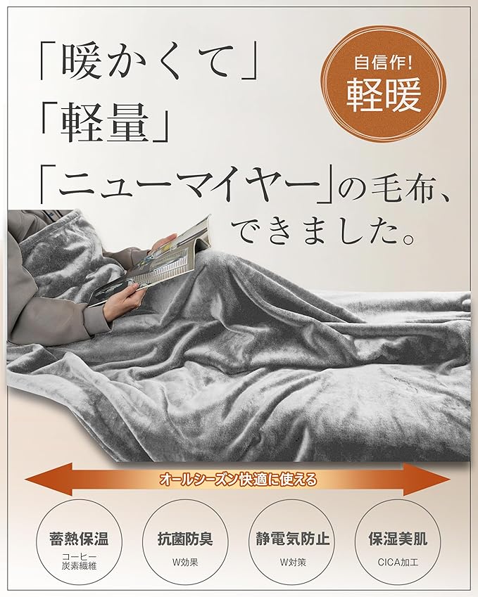 【最新技術 伝統のニューマイヤー毛布】 ニューマイヤー毛布とは、編み上げた生地の両面に起毛仕上げを施した1枚毛布です。1枚で仕上げているため、両面がふわふわで厚みがあるにも関わらず軽いのが特徴です。軽くてふんわり極上の肌触りで、睡眠中のストレスを軽減します。また、毛玉になりにくく、ホコリも出にくい。たった1枚でも従来の2枚合わせ毛布に匹敵する優れた発熱・保温性を誇ります。